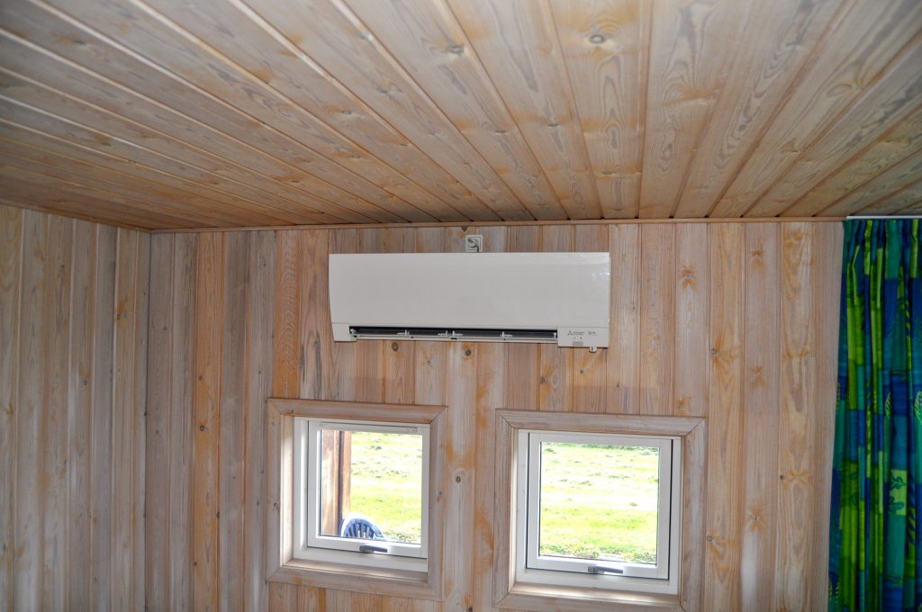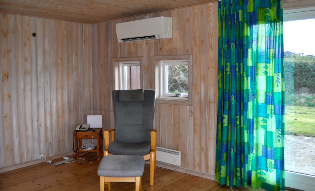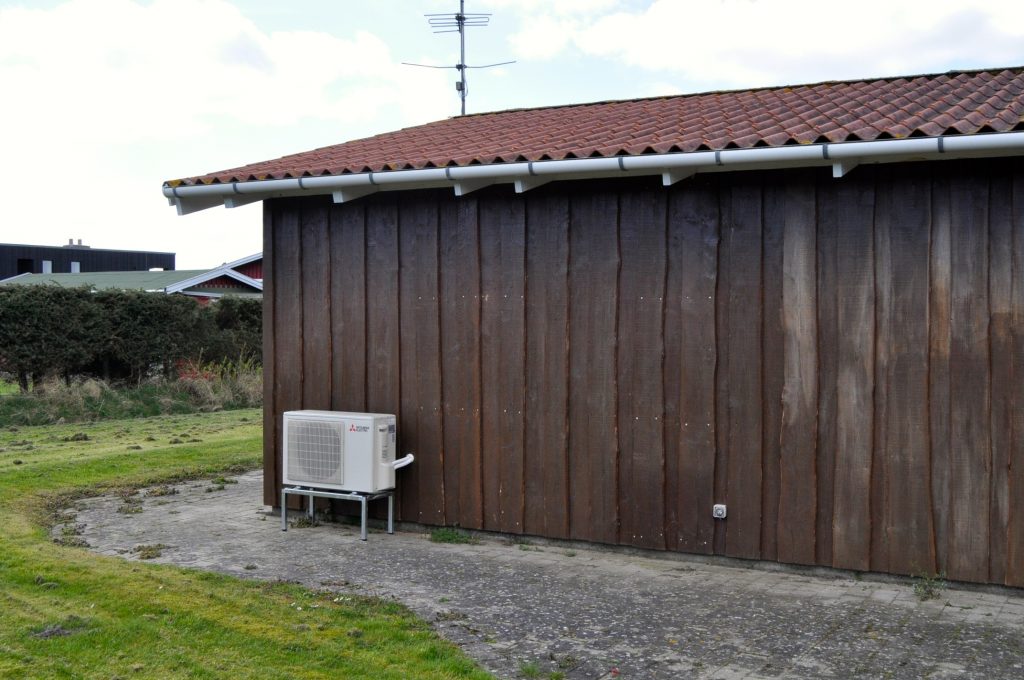 I et sommerhus på Skødshoved, Mols, ønskede ejeren, at rørene mellem varmepumpens indedel og udedel blev skjult. Her burde rørene kunne ses, men et par af brædderne blev fjernet og sat på igen, for at skjule rørene Rørene fra varmepumpens indedel går ud lige bag pumpen Det færdige resultat fik et rent udseende uden rør på hverken inder- eller ydersiden af huset